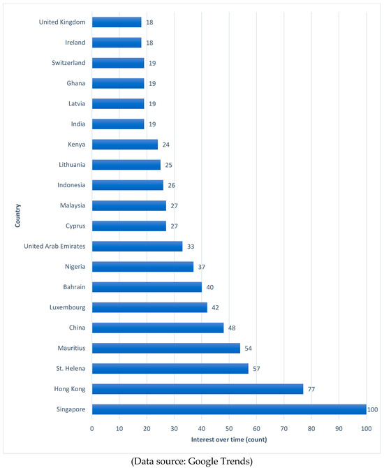 Financial inclusion is commonly defined as the access and use of formal financial services by members of a population [4]. Financial inclusion is a top policy priority in many countries. There has been a global campaign to use Fintech-enabled digital financial services to increase financial inclusion [4,5]. However, the effectiveness of Fintech and digital finance tools in accelerating financial inclusion depend on people’s acceptance of the digital financial services offered by Fintech and digital finance providers [6]. Many factors influence people’s acceptance of digital finance services. One such factor is people’s awareness, or lack of awareness, of the digital financial services offered by Fintech and digital finance providers [7,8,9], and we argue that one way to gauge the level of awareness about digital finance and Fintech tools is by assessing people’s interest in information about Fintech, digital finance, and financial inclusion on the Internet through their web search activity.