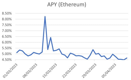 In Figure 2, the APY can vary abruptly based on the economic environment. Here, for instance, the spikes might relate to the US banking crisis—Silicon Valley Bank and Signature Bank—in March. This might be because the investors were looking to move their funds out of relatively higher-risk assets, especially since both these banks were heavy lenders to the technology sector, thus the spill-over effect. This assumption would need further testing to be properly validated and is out of the scope of this article. However, the main reason for such spikes observed in Figure 2 is likely due to the Shanghai release allowing withdrawals and increasing reward (g increased) [24,25].