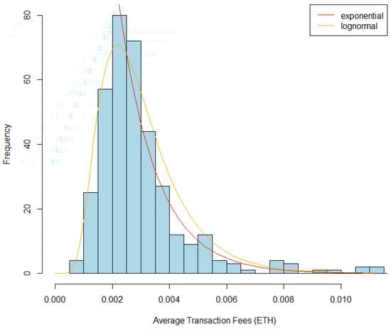 In Section 4.4, we assumed that the transaction fee was represented by a random variable whose law is an exponential one. This is a consequence of the discussion depicted therein about the memoryless process. Having an estimation of F would require to have access to a sufficiently large number of transaction fees at a given time. If the collected sample is a sufficiently good representation of the whole population, the average transaction fee would be close to its true value, and, more generally, we would have access to a broader distribution of transaction fees. Only then would we be able to have an idea of the distribution of the transaction fees, i.e., if they follow an exponential law rather than a log-normal one. Below, we have, however, performed a fit to the distribution of daily average transaction fees (in ETH) for the Ethereum blockchain (see Figure 3). The data were selected from 7 November 2022 to 7 November 2023 on Blockchair (https://blockchair.com). The time period corresponds to Ethereum 2.0 and is a relatively long time after the fork, allowing more stability in the chain data. We fit the exponential and lognormal distributions to the data histogram; the other distributions (e.g., normal) do not have enough significance to be shown here. In Figure 3, we rescale the distributions to the empirical histogram so that both fits can be shown in the same figure.