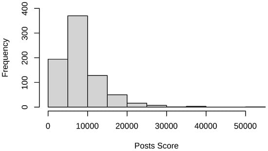 Figure 3 displays a histogram of the scores of posts collected from a cryptocurrency-related subreddit over the two-year period from 1 January 2021 to 31 December 2022. The distribution is skewed to the left. Most posts received high scores, with values around 10,000, with a few posts achieving very high scores. The score of a post, typically determined by upvotes minus downvotes, reflects the community’s engagement and approval of the content.