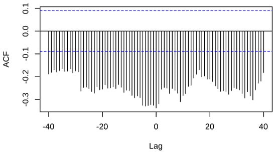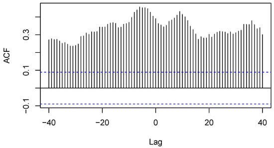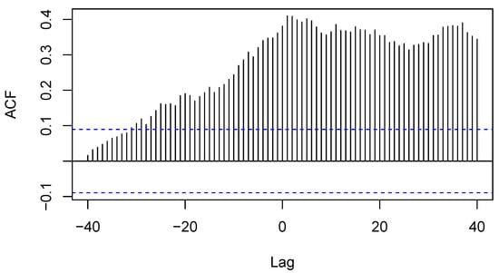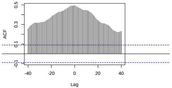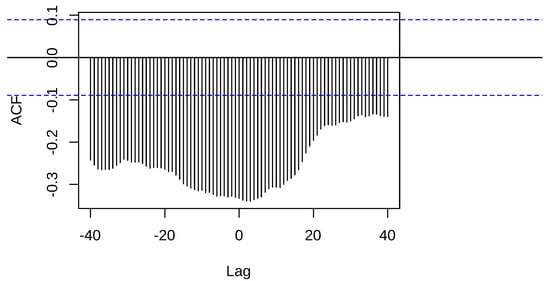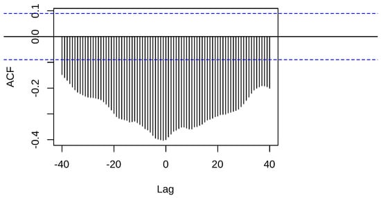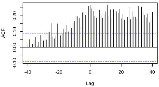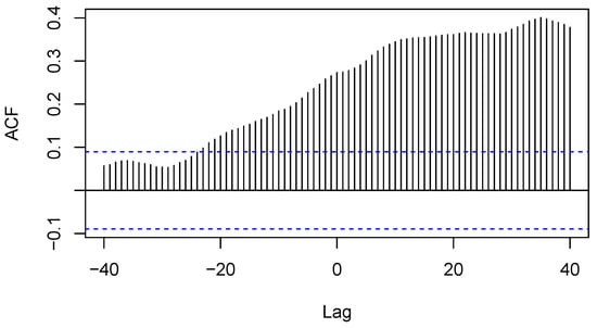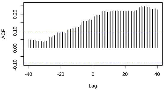 Figure 4 displays the autocorrelation graph between the daily closing price of Bitcoin (BTC) and the number of posts collected from the r/cryptocurrency subreddit every day, using lag values from to 40. A negative lag value suggests that the number of posts in a day may influence the price of BTC for the next days, while a positive lag value suggests that the price of BTC may influence the number of posts during the next days. The analysis reveals significant correlations between the two variables, which extend for a long period of time. Specifically, the positive correlation indicates that as the BTC price increases, the number of posts on the subreddit tends to increase as well, and vice versa. Additionally, when one of the two variables decreases, so does the other. The correlation becomes significant at . Correlations increase in significance as the lag value increases. The presence of these correlations suggests that there is an interplay between the two variables. An increased number of posts, which signifies growing user interest, leads to an increase in BTC price in the next days. As the lag value becomes positive, it suggests that increases in BTC price cause an increase in online activity and the effect lasts for more than a month.