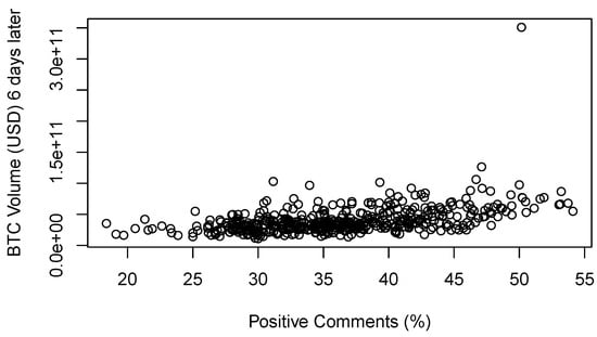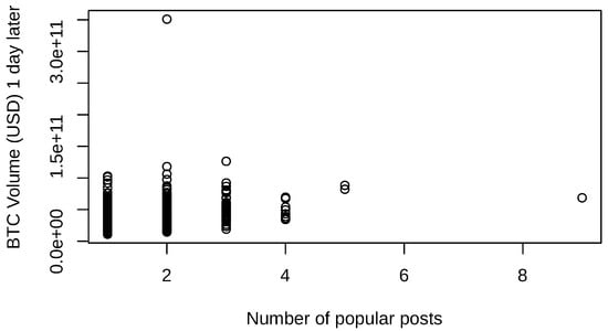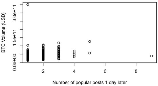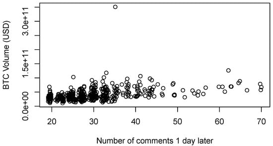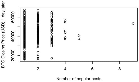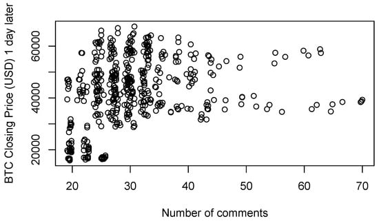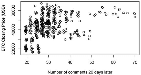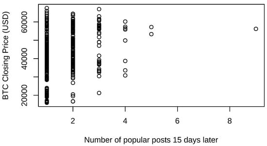 As an example of the relationship between the two variables, Figure 5 and Figure 6 present scatter plots of the daily closing price of Bitcoin (BTC) against the number of posts on the r/cryptocurrency subreddit at different lag values. Both figures are very similar and reveal the positive correlations between the two variables. Figure 5 shows that there exists a trend for BTC closing price to follow the number of posts in the r/cryptocurrency subreddit the next day (Pearson’s ), while Figure 6 shows that BTC closing price also influences the user activity, even 15 days later (Pearson’s ). However, the relationship is not absolute in any case. This suggests that while there is a general tendency for BTC price movements to influence subreddit activity, and vice versa, other factors may also be at play, and the relationship is not necessarily deterministic.