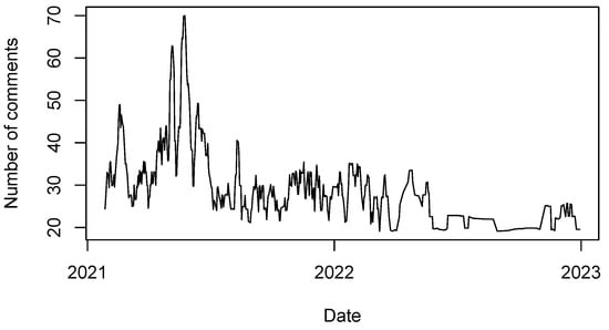 We used the PRAW API [] to extract posts and comments from 1 January 2021 to 31 December 2022 from the r/cryptocurrency subreddit. The posts and comments of the last day were collected on a daily basis. It has been reported that Reddit posts and comments typically receive the majority of their votes within the first 24 h of being posted []. This pattern is driven by the way Reddit’s algorithm and user engagement work. By gathering data daily, we aim to capture these fluctuations and provide a more accurate and responsive analysis. Additionally, daily data collection allows us to develop models that can operate in real time or near-real time, which is crucial for traders and analysts who rely on up-to-date information to make informed decisions. This approach not only enhances the granularity of our analysis but also ensures that our findings are relevant and actionable in the fast-paced environment of cryptocurrency trading.