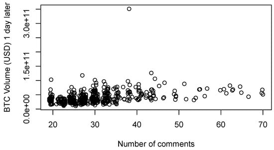 The autocorrelation analysis showed significant correlations between Bitcoin trading volume and the number of comments, indicating that increased trading volume might drive subsequent discussions on Reddit, aligning with the observations made by Hutto et al. [] and Ba et al. [].