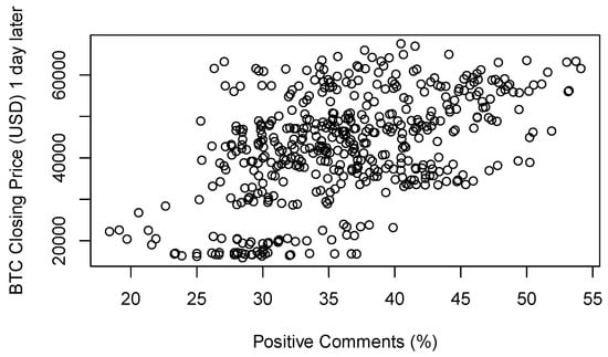 Our analysis indicates that positive comments on the r/cryptocurrency subreddit increase not only when Bitcoin prices rise but also in the period leading up to price increases. This suggests that user sentiment on social media could be a predictive indicator for future price movements. While the correlation is not absolute, the presence of positive discussions could signal upcoming market trends. This finding aligns with previous research demonstrating that social media activity can influence future Bitcoin prices. For instance, Mai et al. [] found that social media sentiment has a significant impact on Bitcoin value, supporting the notion that user activity on platforms like Reddit can provide valuable predictive insights. Additionally, Wołk [] showed that Twitter sentiment could predict Bitcoin returns, further supporting the potential for social media activity to serve as a market predictor.