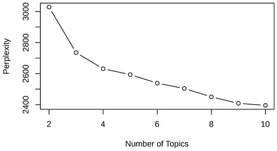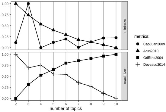 - Choosing the number of topics: The optimal number of topics was determined using a perplexity plot and multiple evaluation metrics, as produced by the ldatuning [] package in GNU R [], with each metric offering a different perspective on model evaluation.