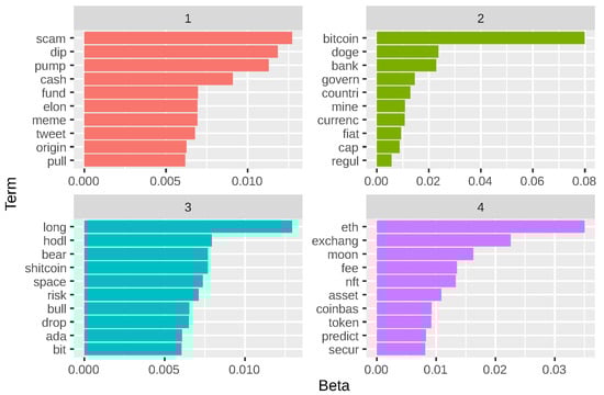 In addition to sentiment analysis, topic modeling techniques such as latent Dirichlet allocation (LDA) have been employed to understand the thematic structure of discussions within cryptocurrency communities []. Loginova et al. [] applied aspect-based sentiment analysis techniques to analyze online cryptocurrency text data, identifying key themes and their evolution over time. This approach provides insights into the main areas of interest and concern within the community, which can be correlated with market events and trends. Phillips and Gorse [] examined the relationship between cryptocurrency price changes and topic discussions on social media, using dynamic topic modeling and Hawkes models, and found that certain topics, such as “risk and investment vs. trading” and “fundamental cryptocurrency value”, tend to precede specific types of price movements, like price falls and rises.