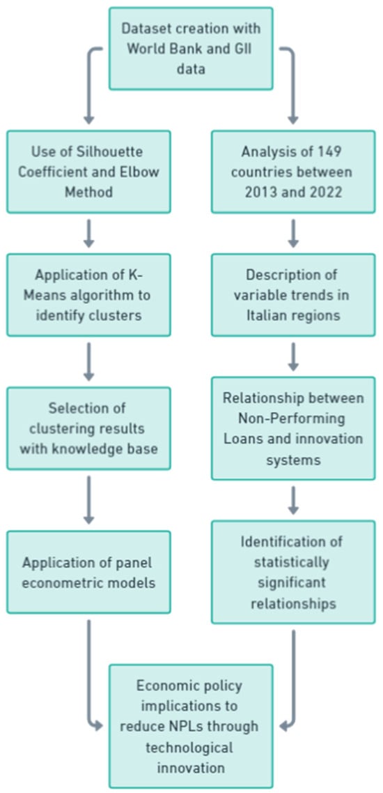 Advantages and limitations of using k-means clustering. Using k-means clustering in the analysis of NPLs is appropriate for several reasons, particularly when it comes to understanding the relationship between financial instability and innovation. The primary advantage of k-means clustering lies in its simplicity and computational efficiency, which makes it suitable for large datasets like the one used in the analysis of 149 countries over the period 2013–2022. By grouping countries based on their NPL ratios, k-means clustering can uncover patterns and insights that may not be immediately visible through traditional statistical methods. One key reason k-means clustering is useful in this context is that it allows for the segmentation of countries into different clusters based on their financial health, as indicated by the proportion of NPLs to total gross loans. This segmentation is important because countries with similar levels of NPLs are likely to exhibit similar financial and innovation behaviors. For example, countries with high levels of NPLs may face financial distress that limits credit availability, leading to reduced investment in innovation, particularly in capital-intensive sectors such as information and communication technology (ICT). Conversely, countries with low NPL levels might have more stable banking sectors, enabling them to better support innovation through easier access to financing. Additionally, the k-means algorithm helps identify clusters of countries that are not obvious based on geographic or economic categorizations. By relying purely on the data, k-means can group countries with similar financial characteristics, even if they are geographically dispersed or belong to different economic tiers. This is particularly valuable in a global analysis, where economic behaviors related to NPLs and innovation vary widely between regions and sectors. The clustering results can, therefore, offer a more nuanced understanding of how financial instability influences innovation across different contexts, which can inform more targeted policy interventions. Another advantage of k-means clustering is that it allows for analysis beyond simple correlations. While traditional methods might focus on the direct relationship between NPL levels and innovation outputs (e.g., ICT exports or Cultural and Creative Services exports), clustering enables a more holistic view by considering the entire distribution of NPLs across countries. This can reveal whether certain clusters of countries behave differently in terms of innovation despite having similar NPL ratios, offering insights into the role of other variables such as governance, economic diversification, or financial sector regulation. This article uses both the Elbow method and the Silhouette coefficient to optimize the k-means clustering process, ensuring that the chosen number of clusters is the most appropriate for the data. This optimization is crucial because k-means requires the user to specify the number of clusters in advance, and an incorrect choice could lead to misleading results. By carefully selecting the optimal number of clusters, the analysis ensures that the segmentation of countries is meaningful and captures the most relevant patterns in the data. However, it is also important to acknowledge some limitations of k-means clustering in this context. One challenge is that k-means assumes that clusters are spherical and equally sized, which may not always reflect the true distribution of NPLs across countries. Financial instability and innovation are complex phenomena, and their relationships may not conform to the k-means algorithm’s assumptions. Despite this, the use of k-means remains appropriate in this analysis due to its computational efficiency and ability to provide valuable insights into the global dynamics of NPLs and innovation.