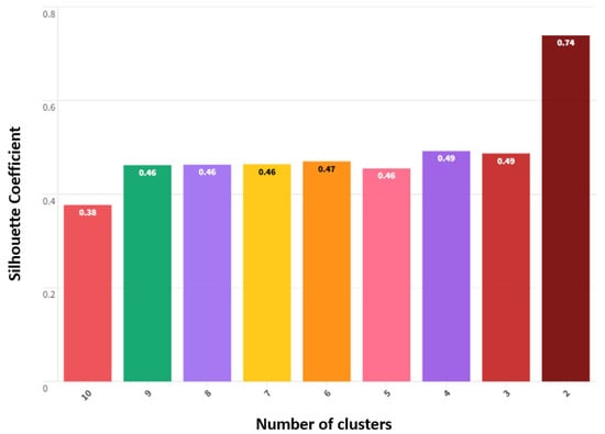 In what follows, a cluster analysis with the k-means algorithm is shown. Since the k-means algorithm is an unsupervised ML algorithm, it is necessary to find tools to help identify the optimal number of clusters. In this case, we compare the results of clusterization using the Silhouette coefficient with the Elbow method. Clustering with the k-means algorithm optimized with the Silhouette coefficient involves assigning a number to each cluster. This number ranges from −1 to 1. The closer the value is to 1, the more efficient the clustering is [108,109]. Therefore, we calculate the Silhouette coefficient value for k values between 2 and 10. The number of clusters that maximize the Silhouette coefficient occurs at k = 2 (see Figure 2).