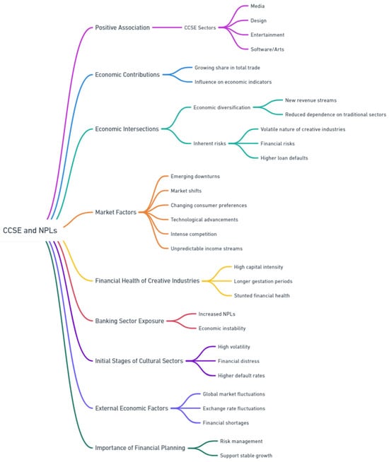 According to the panel data regression results, the level of NPL is positively associated with CCSE, encompassing sectors like media, design, entertainment, and software, which are increasingly recognized as vital components of modern economies. As these sectors grow and contribute a larger share to total trade, they influence various economic indicators, including the NPL ratio in the banking sector. Understanding why these two variables might rise together requires analyzing their underlying economic interactions. Economic diversification through an increase in CCS exports can have a dual effect; while it provides new revenue streams and reduces dependence on traditional sectors, it also involves inherent risks due to the volatile nature of creative industries. The financial risks associated with funding these innovative but uncertain ventures can lead to higher loan defaults, increasing the NPL ratio [75]. This risk is particularly acute during economic downturns or market shifts that disproportionately affect the creative sectors. The creative industries often face significant market fluctuations due to changing consumer preferences, technological advancements, and intense competition. These fluctuations can result in unpredictable income streams for businesses in this sector, making them more prone to defaulting on loans. Banks exposed to these sectors might see an increase in NPLs as businesses struggle to maintain consistent revenue, especially during periods of economic instability [123]. The cultural and creative sectors often require substantial upfront investments in technology, talent, and infrastructure. The high capital intensity and longer gestation periods before seeing returns can strain the financial health of companies within these industries. As banks extend credit to support these investments, the likelihood of defaults increases if the expected returns are not realized in a timely manner, thereby raising the NPL ratio [74]. While cultural and creative exports can offer stable long-term earnings, their initial stages are often marked by high volatility. The uncertainty in achieving stable earnings can lead to financial distress among businesses, resulting in higher default rates on loans. This trend is exacerbated in economies that heavily invest in boosting their cultural exports without adequate financial safeguards. External economic factors, such as global market demand and exchange rate fluctuations, can significantly impact the earnings from CCS exports. Adverse changes in these factors can lead to unexpected financial shortfalls for businesses, increasing their risk of loan defaults. This external volatility is transmitted to the banking sector, resulting in a higher NPL ratio [124]. The growth of CCS exports as a percentage of total trade can lead to an increase in the NPL ratio due to the high volatility, substantial investment requirements, and market uncertainties inherent in these industries. While these exports contribute positively to economic diversification and innovation, their financial instability and associated risks can strain the banking sector, leading to higher loan defaults. Understanding this relationship underscores the need for careful financial planning and risk management to support sustainable growth in both the creative industries and the broader economy (see Figure 4).