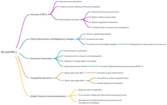 In addition, it is found that the increase in ISI increases NPLs as well, which can be explained through several interconnected mechanisms. This relationship may initially appear counterintuitive, as high levels of NPLs generally indicate financial distress; however, upon closer examination, the dynamic interplay between financial stress and innovation reveals a more complex narrative. Firstly, NPLs often signify periods of economic downturn or financial instability, which create an environment that necessitates innovation. During such periods, banks and financial institutions are compelled to rethink and revamp their risk management strategies and lending practices. The need to mitigate future risks and recover from financial losses drives these institutions to adopt innovative approaches and technologies. For instance, the aftermath of financial crises has historically led to the development and implementation of advanced risk assessment tools, better credit scoring models, and more robust regulatory frameworks [148]. Moreover, the presence of high NPLs can trigger policy interventions and regulatory changes that foster innovation. Governments and regulatory bodies, in response to rising NPLs, may introduce measures aimed at improving financial stability and encouraging sustainable lending practices. These measures can include stricter capital requirements, enhanced oversight, and incentives for technological adoption in the banking sector. Such regulatory changes can act as catalysts for innovation, pushing banks to develop new products and services that align with the revised regulations and market needs [149]. Economic uncertainty, often reflected by high NPL ratios, also plays a crucial role in fostering a culture of innovation. During uncertain times, both businesses and financial institutions seek to diversify their portfolios and reduce dependency on traditional revenue streams. This diversification often leads to investments in R&D, the adoption of cutting-edge technologies, and the exploration of new markets. For example, during the COVID-19 pandemic, many banks increased their investment in digital banking solutions to cater to the changing needs of consumers and ensure a continuity of services [144]. Furthermore, high levels of NPLs can influence the competitive dynamics within the banking sector. Banks with lower levels of NPLs may capitalize on their stronger financial position to innovate and gain market share, while those with higher NPLs may be driven to innovate out of necessity to restore their competitiveness. This competitive pressure can accelerate the pace of innovation across the sector as banks strive to improve their offerings and operational efficiency [150]. Additionally, the interconnectedness of global financial markets means that high NPLs in one region can have spillover effects on other regions, prompting a global response that includes innovative financial solutions. For instance, cross-border lending and international banking practices may evolve in response to rising NPLs in emerging markets, leading to the development of more sophisticated risk assessment and management techniques on a global scale [151]. In conclusion, while high levels of NPLs indicate financial stress and potential economic downturns, they also create a fertile ground for innovation. The necessity to mitigate risks, adapt to new regulations, compete effectively, and respond to global financial dynamics drives banks and financial institutions to adopt innovative practices and technologies. This complex interplay ultimately contributes to the increase in the ISI despite the rise in NPLs, highlighting the resilience and adaptability of the financial sector in the face of challenges (see Figure 5).