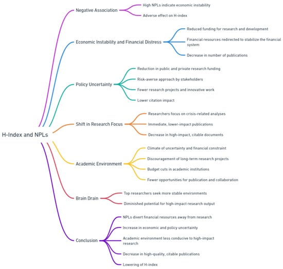 The empirical findings also highlight that NPLs are negatively associated with the H-Index. This relationship is a complex issue rooted in the dynamics of economic instability, financial sector health, and the subsequent impact on academic productivity and citation impact. The H-Index measures both the productivity and citation impact of a researcher, institution, or journal, focusing on citable documents such as articles, reviews, and conference papers. When NPLs increase, it often reflects broader economic and financial stress that can adversely affect this index. Firstly, high levels of NPLs are indicative of economic instability and financial distress within the banking sector. This instability can lead to reduced funding for R&D activities as financial resources are redirected toward stabilizing the financial system and addressing the immediate crises caused by rising NPLs. For instance, during periods of economic downturns and increased NPLs, banks and other financial institutions may cut back on investments in academic and research institutions, leading to a decrease in the number of publications and a subsequent drop in the H-Index [144]. Moreover, economic policy uncertainty, which often accompanies rising NPLs, can further exacerbate the decline in academic productivity. Increased policy uncertainty can lead to a reduction in both public and private research funding as stakeholders adopt a more risk-averse approach. This reduction in funding translates to fewer research projects being undertaken, less innovative work being published, and consequently, a lower citation impact, as reflected in the H-Index [152]. Furthermore, the academic community is not immune to the broader economic conditions that affect the financial sector. Researchers, particularly those in economics and finance, may shift their focus from innovative research to more immediate, crisis-related analyses and publications. While this shift is critical for addressing the pressing issues of the time, it may not lead to high-impact, citable documents that contribute significantly to the H-Index. The urgency to address the financial crises can result in a proliferation of lower-impact publications that do not receive the same level of citations as more innovative, groundbreaking research [153]. Additionally, high levels of NPLs can influence the overall academic environment by creating a climate of uncertainty and financial constraint. This environment can discourage long-term research projects and collaborations that are often necessary for producing high-quality, citable research. Academic institutions may face budget cuts, leading to fewer opportunities for researchers to publish their work and engage in collaborative projects that enhance citation impact. The stress on financial systems due to high NPLs can also lead to a brain drain, where top researchers and academics seek more stable environments, further diminishing the potential for high-impact research output [150]. In conclusion, the increase in bank NPLs to total gross loans (%) negatively impacts citable documents’ H-Index by diverting financial resources away from R&D, increasing economic and policy uncertainty, and creating an academic environment less conducive to high-impact research. These factors collectively lead to a decrease in the number of high-quality, citable publications, thereby lowering the H-Index. Addressing the underlying causes of high NPLs and stabilizing the financial sector are crucial for maintaining robust academic productivity and citation impact (see Figure 6).