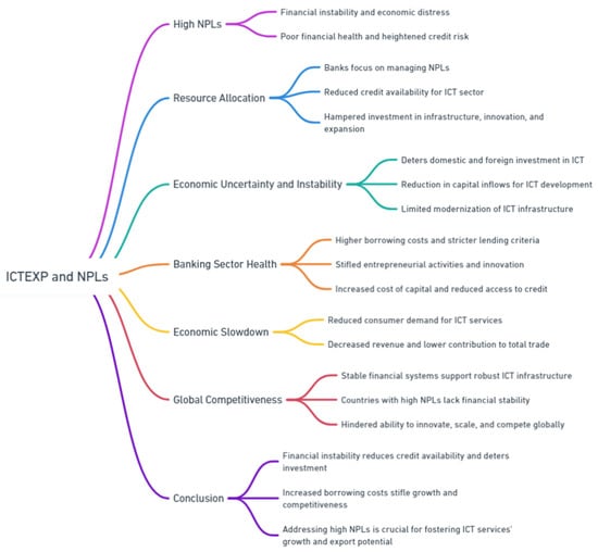 Moreover, NPLs decrease with the increase in ICTEXP due to several interconnected economic and financial factors that impede the overall efficiency and competitiveness of the ICT sector. Firstly, high levels of NPLs are indicative of financial instability and economic distress within a country. When banks accumulate a significant proportion of NPLs, it reflects poor financial health and heightened credit risk, which necessitates banks to divert their resources and focus on managing these non-performing assets rather than extending credit to other sectors, including ICT. This reallocation of resources can result in reduced availability of credit for businesses in the ICT sector, hampering their ability to invest in infrastructure, innovation, and expansion activities essential for competing in international markets. Secondly, economic uncertainty and instability, which are often associated with high NPL ratios, can deter both domestic and foreign investment in the ICT sector. Investors tend to be risk-averse during periods of financial instability, leading to a reduction in capital inflows necessary for developing ICT services. The decrease in investment can impede the growth and modernization of ICT infrastructure, thereby limiting the sector’s ability to offer competitive services in the global market [152]. Moreover, the banking sector’s health is closely linked to the overall economic environment, which in turn affects the ICT sector. A financially unstable banking system due to high NPLs can lead to higher borrowing costs and stricter lending criteria. These conditions can stifle entrepreneurial activities and innovation within the ICT sector as firms face higher hurdles in securing necessary funding for development and export activities. The increased cost of capital and reduced access to credit can significantly impede the growth of ICT services exports [153]. Additionally, high NPLs can lead to a broader economic slowdown, which impacts consumer demand for ICT services both domestically and internationally. As economic conditions deteriorate, businesses and consumers may cut back on spending, including on ICT services, which reduces the overall demand and, consequently, the export potential of these services. This demand reduction can have a cascading effect on the ICT sector, leading to decreased revenues and a lower contribution to total trade. Furthermore, the correlation between financial health and trade performance is also reflected in the competitiveness of the ICT sector on a global scale. Countries with stable financial systems and low NPL ratios tend to have better-developed ICT infrastructure and more robust export strategies. In contrast, countries struggling with high NPL ratios may lack the necessary financial stability to support their ICT services’ continuous development and competitiveness in the international market. The lack of a supportive financial environment can hinder the ability of ICT firms to innovate, scale, and compete globally [154]. In conclusion, the decrease in NPLs with the increase in ICTEXP can be attributed to the financial instability and economic uncertainty that high NPL ratios bring. These conditions reduce the availability of credit, deter investment, increase borrowing costs, and ultimately stifle the growth and competitiveness of the ICT sector in the global market. Addressing the underlying issues of high NPLs is crucial for fostering a stable financial environment conducive to ICT services’ growth and export potential (see Figure 7).