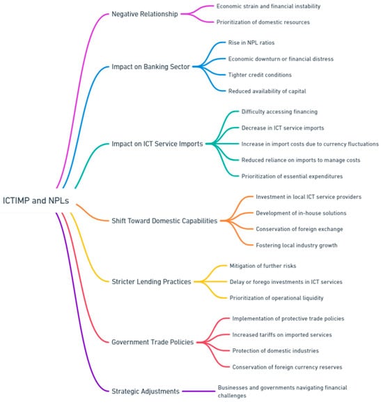 The negative relationship between ICTIMP and NPLs can be understood through a combination of economic strain, financial instability, and prioritization of domestic resources. This relationship highlights how the health of the banking sector can directly impact the import behaviors of an economy, particularly in sectors as vital as ICT services. ICT services imports encompass various critical components such as software, IT consulting, data processing, and telecommunication services. These imports are essential for maintaining and advancing technological infrastructure, supporting business operations, and fostering innovation. However, when the banking sector experiences a rise in NPL ratios, it signals broader economic and financial instability that can curtail the ability and willingness of a country to import such services. When the NPL ratio increases, it reflects a deteriorating financial situation within the banking sector, often due to borrowers’ inability to repay loans. This scenario typically arises during economic downturns or periods of financial distress. As banks struggle with higher NPLs, they become more risk-averse, leading to tighter credit conditions and reduced availability of capital for businesses and consumers. Consequently, companies, especially those in need of ICT services, may find it challenging to secure financing for imports, leading to a decrease in ICT services imports [151]. High NPL ratios can undermine confidence in the financial system, leading to broader economic instability. This instability can result in significant currency fluctuations, making imports more expensive. As the cost of importing ICT services rises, businesses may reduce their reliance on these imports to manage costs, further decreasing the percentage of ICT services in total trade. Financial instability often forces businesses to prioritize essential expenditures, sidelining investments in ICT services that might be deemed non-critical during economic hardships [123]. In response to rising NPL ratios and the associated financial strain, governments and businesses may shift their focus toward strengthening domestic capabilities. This shift can involve investing in local ICT service providers or developing in-house solutions to reduce dependency on costly imports. Such strategies are aimed at conserving foreign exchange and fostering local industry growth, which becomes more pronounced when the banking sector is under stress and external borrowing or investment is less viable [155]. High NPL ratios lead to stricter lending practices as banks seek to mitigate further risks. Companies facing credit constraints may delay or forgo investments in ICT services, which are often seen as capital-intensive. Instead, they might prioritize maintaining operational liquidity and addressing immediate financial obligations. This shift in investment priorities reduces the demand for ICT services imports, reflecting a broader trend of scaling back on expenditures perceived as less urgent [153]. Governments facing high levels of NPLs may implement protective trade policies to stabilize the economy. These policies could include increased tariffs on imported services, including ICT, to protect domestic industries and conserve foreign currency reserves. Such measures directly reduce the import levels of ICT services, as higher costs deter businesses from procuring services from abroad [156]. These factors collectively discourage the import of ICT services, reflecting a strategic adjustment by both businesses and governments to navigate financial challenges (see Figure 8).