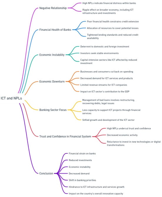 Finally, the level of NPLs decrease with the increase in ICT due to several interrelated factors that undermine economic stability, financial resource allocation, and overall confidence in the banking sector. High levels of NPLs indicate financial distress within banks, which has a ripple effect on the broader economy, including ICT infrastructure and investments. This relationship can be dissected into a few key areas. Firstly, high NPLs signify poor financial health of banks, which in turn constrains their ability to extend credit to various sectors, including ICT. When banks face a high proportion of bad loans, they need to allocate more resources to cover potential losses, leading to tightened lending standards and reduced availability of credit. This credit crunch affects businesses across the economy, including those in the ICT sector, which rely heavily on continuous investments for infrastructure development, technological advancements, and innovation [144]. Secondly, economic instability, which often accompanies rising NPLs, can deter both domestic and foreign investment. Investors seek stable environments where the risk of financial loss is minimized. High NPLs signal financial instability and increased risk, causing investors to become cautious or withdraw their investments altogether. This reduction in investment particularly affects capital-intensive sectors like ICT, which require substantial and ongoing financial inputs to maintain and upgrade infrastructure, adopt new technologies, and support innovation activities [152]. Additionally, financial instability reflected by high NPLs can lead to an overall economic downturn. In such periods, both businesses and consumers may cut back on spending, including ICT services and products. The decreased demand can limit the revenue streams for ICT companies, making it challenging for them to sustain operations, invest in new technologies, or expand their services. This slowdown directly impacts the ICT sector’s contribution to the GII [153]. Moreover, the banking sector’s focus shifts significantly when dealing with high levels of NPLs. Banks must manage these bad loans, which often involve restructuring, recovering bad debts, and dealing with legal issues. This diversion of focus and resources means that banks have less capacity to support ICT projects through loans or other financial services. This lack of support can stifle the growth and development of the ICT sector, as it depends heavily on bank financing for both operational and capital expenditures [150]. Furthermore, the presence of high NPLs can also undermine the trust and confidence in the financial system. A banking sector plagued with bad loans can erode confidence among businesses and consumers alike, leading to decreased economic activity. When trust in the financial system wanes, it can result in a lower rate of adoption and integration of ICT solutions as both individuals and businesses might be reluctant to invest in new technologies or digital transformations that require high upfront costs and rely on a stable financial environment [154]. In conclusion, the negative relationship between ICT and NPLs can be attributed to the financial strain on banks, reduced investments, economic instability, decreased demand, and a shift in banking priorities. These factors collectively hinder the growth and development of ICT infrastructure and services, ultimately affecting the country’s overall innovation capacity (see Figure 9).