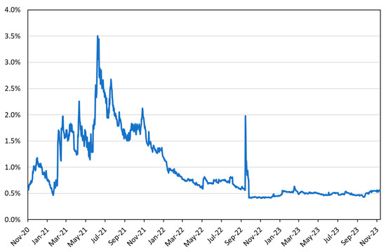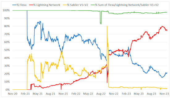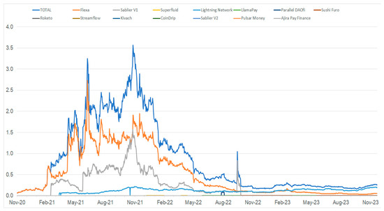 The market for DeFi payment protocols is highly concentrated: four protocols (Flexa [20], Lighting Network [16], Sablier [17], and LlamaPay [18]) represent almost 100% of the TVL (Figure 3), with the first three accounting for the largest share. Two protocols, in particular, dominated at the end of 2023, the Lightning Network and Flexa, with shares of 74.53% and 21.52%, respectively, on 30 November 2023 (see Appendix C).