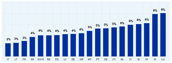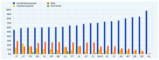 According to the Study on the Payment Attitudes of Consumers in the Euro area [49], in all the participating countries, crypto-assets are primarily used for investment purposes. Lithuania, France, Latvia, Italy, Luxembourg, and Spain stand out as the countries with the highest percentage use of crypto-assets for payments (Figure 6). Beyond these variations, the differences between the countries do not lead to any other apparent conclusions. Overall, the use of crypto-assets for payments appears to be low.