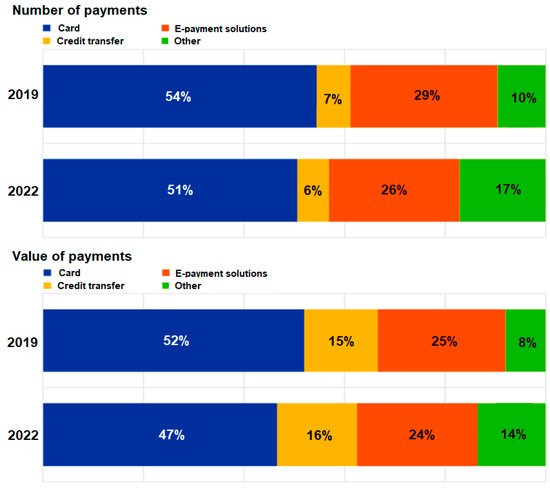 Breakdown of number and value of online payments by payment instrument in the euro area, 2019–2022. (Source: Study on the Payment Attitudes of Consumers in the Euro area (SPACE)—2022 [49]).