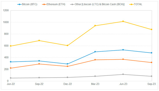 At the global level, the United States recorded the highest number (28,143) of cATMs in 2023, according to CoinATM radar [46], with more machines found there than elsewhere in the world. Canada (2803) and Australia (760) followed in second and third place. The UK, which was ranked 17th in 2022, fell to 61st place in 2023. This was probably due to the fact that the UK Financial Conduct Authority (FCA) has actively been pursuing crypto ventures in the UK. The FCA has been raising concerns about crypto-assets, in part due to the spike in interest in the crypto market that occurred in 2021, and because crypto-assets remain an unregulated product in the UK [47].