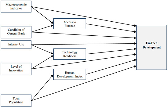 Conceptual framework showing direct and mediated relationships influencing FinTech development in ASEAN-4 countries.