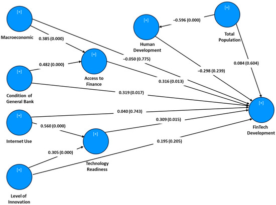 Furthermore, the mediation hypothesis test results (Table 6) indicate that four out of five mediation hypotheses are significant (H14, H15, H16, and H17). Access to finance fully mediates the relationship between macroeconomic indicators and FinTech development and partially mediates the relationship between the condition of general banks and FinTech development. Technology readiness is proven to fully mediate the relationship between internet use and the level of innovation in FinTech development. The human development index cannot mediate the total population and FinTech development relationship.