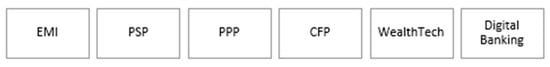 FinTech in Lithuania is made up of various segments (see Figure 2), including electronic money institutions (EMIs), payment service providers (PSPs), peer-to-peer lending platforms (PPPs), crowdfunding platforms (CFPs), investment and asset management companies (WealthTech), and digital banking. These segments ensure the creation and development of innovative financial services, but economic and regulatory factors influence this.