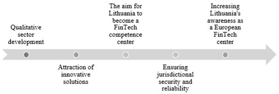 The Lithuanian Government actively promotes the development of FinTech, recognizing its potential to create new jobs, attract foreign investment, and contribute to economic growth. Therefore, the Ministry of Finance of the Republic of Lithuania has provided guidelines for the development of the FinTech sector for 2023–2028 (see Figure 3) in order to further strengthen the country’s position as a regional FinTech center.
