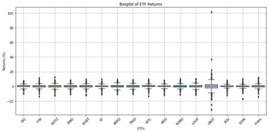 To provide an initial overview of the performance dispersion, Figure 1 presents a box plot of daily returns for the 15 AI-themed ETFs in the sample. The plot summarizes the return distribution via interquartile ranges (IQRs), medians, and outliers, offering a compact visualization of the volatility and return asymmetry across the sample.