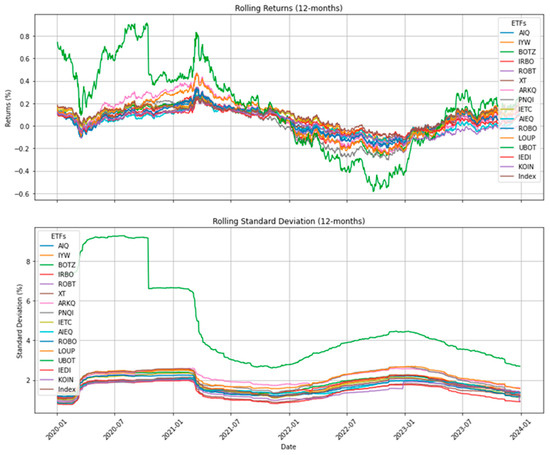 Figure 2 provides a two-panel visualization of the 12-month rolling mean and standard deviation of daily returns for the AI-themed ETFs over the period from early 2020 to the end of 2023. These panels complement the static distributional perspective in Figure 1 by illustrating the evolution of return dynamics and time-varying volatility, thereby offering a richer temporal understanding of risk–return behavior.