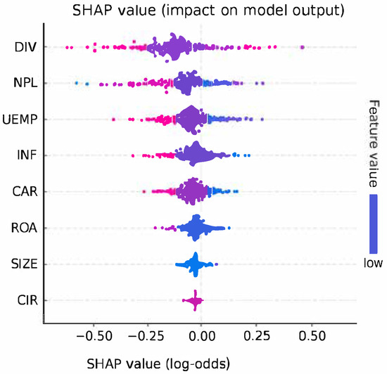 In addition to the standard feature importance provided by the Random Forest model, we implemented SHAP (SHapley Additive exPlanations) analysis to gain a deeper understanding of each feature’s marginal contribution to the model’s output. SHAP values offer a consistent and unified measure for feature relevance by computing the marginal contribution of each variable across all possible model predictions, as shown in Figure 4. The SHAP summary plot shown in the following figure confirms the critical influence of income diversification (DIV), non-performing loans (NPLs), and macroeconomic variables such as unemployment (UEMP) and inflation (INF). These insights guided our understanding of model behavior and can inform regulators on which indicators are most predictive of financial distress.