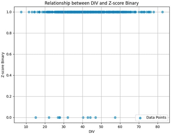 In Figure 5, the paper uses a scatter plot to visualize the relationship between the DIV and Z-score. The X-axis represents the variable of DIV, with values ranging from 0 to 100, while the Y-axis represents the variable of Z-score, with values ranging from 0 to 60. Additionally, each blue dot represents a specific data point, demonstrating the combination of the DIV and Z-score values for that point. We can also notice that there are many points clustered tightly together in a certain area, thus indicating that there is a moderately strong relationship between income diversification and bank stability, because some of the points are spread out more widely across the scatter plot. Additionally, the paper separates the classes of the classification in the scatter plot to provide a clear separation between the two classes effectively, as shown in Figure 6; after the classification of the Z-score, there are a few blue dots scattered at 0, while most of the dots are clustered at 1, demonstrating that most of the points belong to class 1. The clear separation illustrates that the DIV value can be used to distinguish between the two classes effectively; the clustering points of 1 signify that higher DIV values are associated with Z-score binary 1 and lower DIV values are associated with Z-score binary 0.