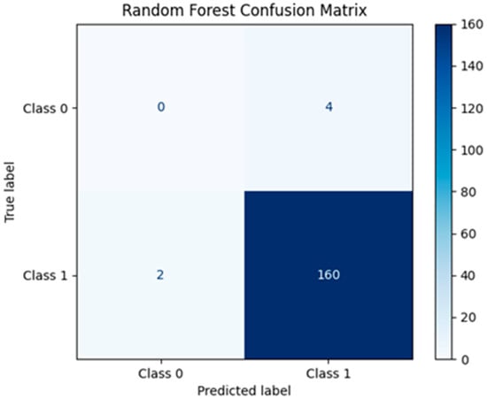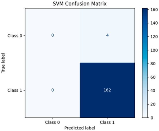 This article employed the confusion matrix to evaluate the performance of the Random Forest and SPV classification models, as illustrated in Table 5. The findings reveal that Random Forest and SVM accurately predict 160 and 162 positive observations, respectively, whereas both models correctly predict 0 negative data, as shown in Figure 7 and Figure 8. Furthermore, the incorrectly anticipated positive observation values are 2 and 0, whereas the inaccurate negative values are 2 and 0. Accordingly, the findings show that there are high TP and TN values, which confirm that the models correctly predicted most of the positive and negative classes. On the other hand, the low FC and FN show that there are few misclassifications, demonstrating good model performance. Furthermore, the accuracy was used to evaluate the correctness of the two models among the total number of cases studied. In this respect, the accuracy score of both models is 96.39% and 97.59%, respectively, as shown below in Table 5, which indicates that there is a good proportion of correct predictions in both models. Moreover, the F1-score is also adopted in the examination to evaluate the harmonic mean of precision and recall, developing a single metric that balances both concerns. In this regard, the scores of the F1-score show 0.98 and 0.99 respectively, meaning that both models have good balances between precision and recall. To address the issue of class imbalance noted in the initial model evaluation, where both RF and SVM failed to identify any distressed banks (True Negatives = 0), we applied a manual oversampling technique. This rebalanced the dataset by increasing the number of minority class instances. The results, post-rebalancing, show substantial improvement. Random Forest achieved an F1-score of 0.995 and recall of 1.0 for distressed banks, while SVM achieved an F1-score of 0.985 and recall of 1.0. These results confirm that balancing the data significantly improves the model’s utility as an early warning system. The results show that SVM has a higher accuracy score than Random Forest. Therefore, the results illustrate that income diversification (DIV) has a strong relationship with bank stability measured by the Z-score, and both models can be used to predict the future values of Z-score to improve the prediction level of future bank stability in the banks of Europe.