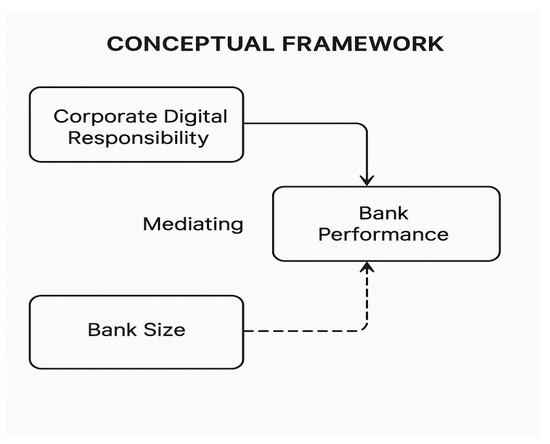 In addition, recognizing the mediating function of bank size in the association between Corporate Digital Responsibility (CDR) and bank performance is essential, especially in Jordan, where digital transformation is swiftly advancing amidst differing institutional capabilities [3,12,13]. Major banks typically possess more sophisticated digital infrastructures, enhanced resource accessibility, and robust regulatory frameworks, enabling them to execute CDR projects more efficiently than smaller institutions [14,15]. Consequently, the size of a bank may substantially affect the usefulness of CDR techniques in yielding performance results, including enhanced client trust, operational efficiency, and innovation [16,17]. By investigating this mediating role, researchers and policymakers can ascertain whether the advantages of CDR are uniformly accessible across institutions of differing sizes, or if customized support is necessary to enable smaller banks to maintain competitiveness in implementing responsible and performance-enhancing digital practices.