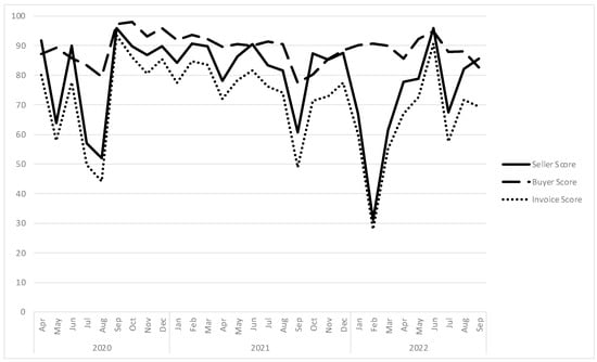 Invoice funding by date of invoice ingestion from April 2020 to September 2022. This figure plots the risk scores (i.e., SURF Scores) of Sellers of invoices (Seller Score), the risk scores of Obligors on the purchased invoices (Buyer Score), and the risk scores of the invoices themselves (Invoice Score). The risk scoring is based on the Crowdz SURF methodology of risk assessment, and it is scaled from 0 to 100 (the higher the SURF Score, the lower the risk). Specifically, the SURF Score represents the probability of timely repayment of the funding to the Funder, and, hence, a 100 SURF Score indicates that there is a 100% probability that the funding will be repaid to the Funder within the Funder-specified timing. The x-axis presents all monthly transactions on the Crowdz Platform, and the y-axis presents the corresponding risk scores. Raw Data is based on 19,278 funding transactions on the Crowdz Platform from 23 April 2020 to 30 September 2022 (Source: Authors’ own creation.).