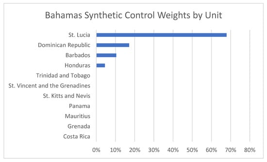 Generally, the Caribbean dataset presents 1320 observations for the eleven control countries plus one treatment country, with a total of nine control variables and one dependent variable, concerning a period from 2012 to 2022. Regarding the SCM, the first result to be displayed is the weighted average of each country to the synthetic Bahamas, as illustrated in Figure 1. Out of the eleven control units, the software only considered four countries and designated the following percentages for the synthetic Bahamas: Barbados 10.4%, Dominican Republic 17.1%, Honduras 4.5%, and St. Lucia 67.9%.