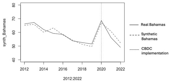 The impact of CBDC implementation in the real Bahamas vs. its synthetic control. Source: results from R.
