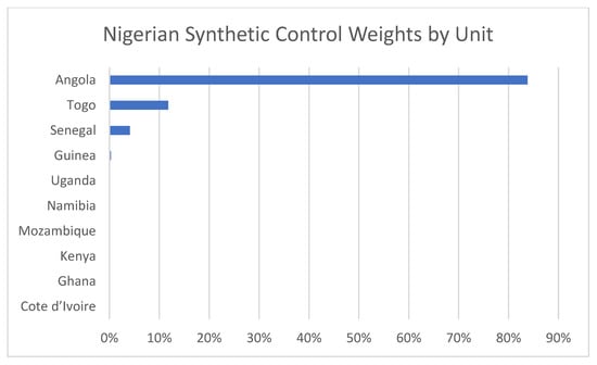 Nonetheless, it is noteworthy that in both cases, there is a high concentration on a single unit. In the case of the Bahamas, St. Lucia represents 67.9% of the weighted average, while for synthetic Nigeria, Angola represents 83.3%. The geographic similarities, access to seaways, sizes, and economic indicators of these countries provide justification for these concentrated outcomes. A final common observation for both cases is that the weighted averages presented in Figure 1 and Figure 2 closely followed actual trends during the pre-intervention period, with a clear variance in the post-treatment period, enabling an assessment of the effects under scrutiny. Hence, we consider this a relevant and significant counterfactual study, a conclusion supported by comparing our results with the SCM references published by [16,17,41].