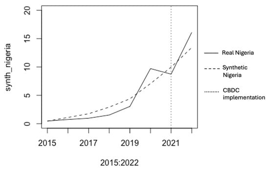 After designing the weighted averages, we continued to elucidate in Figure 4 the behavior of the dependent variable “value of mobile money transactions % of the GDP” for the synthetic (dashed line) and real Nigeria (solid line) to proceed with the comparison. The Y axis is demarked as the dependent variable, while the X axis has the 2015–2022 timeframe, which shows the intervention year (2021) with a dashed line as well. Furthermore, after observing this illustration, it is possible to argue that both the real and synthetic versions present a similar behavior, enough to give us a counterfactual comparative scenario with a variance in tendency after the treatment date.