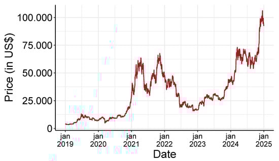 For this study, daily price data were retrieved from the CoinMarketCap website using the crypto2 package in R, which performs automated scraping of the historical records of several financial assets, including Bitcoin, the focus of this research. The analyzed period spans from 1 January 2019 to 31 December 2024. The dataset consists of daily closing prices, which represent the final recorded value of the asset at the end of each trading day.