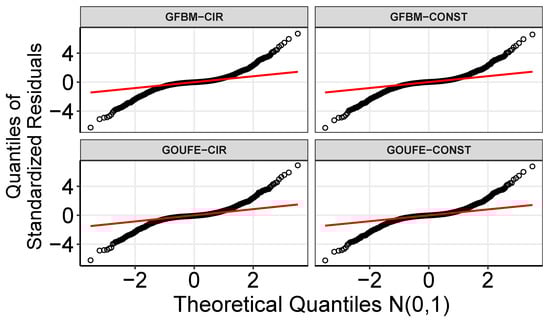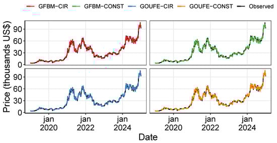 From Table 1 and Table 2, it can be observed that the models with constant volatility (GOUFE-CONST and GFBM-CONST) yield higher log-likelihood values compared to their respective counterparts with CIR-type stochastic volatility. This initial analysis suggests that, for the daily Bitcoin prices, the additional complexity introduced by modeling volatility through the CIR process may not be justified, and assuming constant volatility provides a more efficient fit to the data. Among all analyzed models, GOUFE-CONST stands out with the highest log-likelihood (31,871.26), indicating the best overall fit. Furthermore, the estimated Hurst exponent (H) remains consistently in the range of 0.54 to 0.55 across all models, highlighting the presence of long memory in the daily Bitcoin prices.