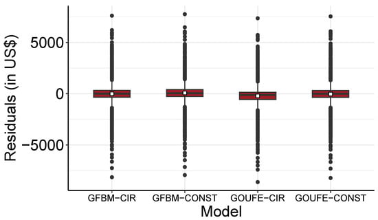 To asses the performance of all four models (GOUFE-CIR, GOUFE-CONST, GFBM-CIR, and GFBM-CONST), their parameters were estimated. The results are presented in Table 1 and Table 2, where dashes (–) indicate parameters not applicable to the constant volatility specification.