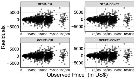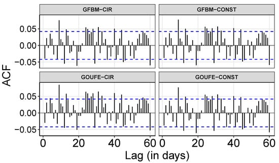 In this section, we use the abbreviations GOUFE-CIR and GOUFE-CONST to refer to the GOU-FE process driven by fBm (3), with the CIR model as the volatility function , and the GOU-FE process with constant volatility (), respectively. Similarly, we use GFBM-CIR and GFBM-CONST to denote the corresponding GBM models obtained from (4).