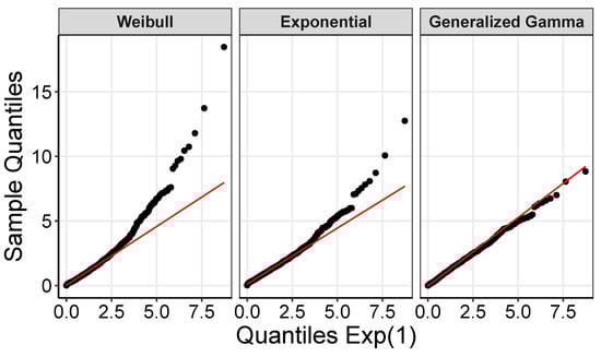 In addition to the numerical criteria, the adequacy of the fitted models was also examined through Cox–Snell residual analysis. QQ-plots of the residuals (Figure 11) illustrate the extent to which the transformed residuals conform to the theoretical distribution. The Exponential and Weibull models display clear deviations from the reference line, especially in the upper quantiles, indicating poor tail modeling. Conversely, the Generalized Gamma model yields residuals that closely align with the diagonal, suggesting a more accurate capture of the underlying duration dynamics.