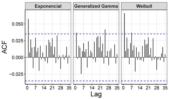 Cox–Snell residuals ACF plots for each model (lag = 35). Exceeding bars (that stretch outside of the region delimited by blue dashed lines) point to the presence of autocorrelation in residuals for all models.