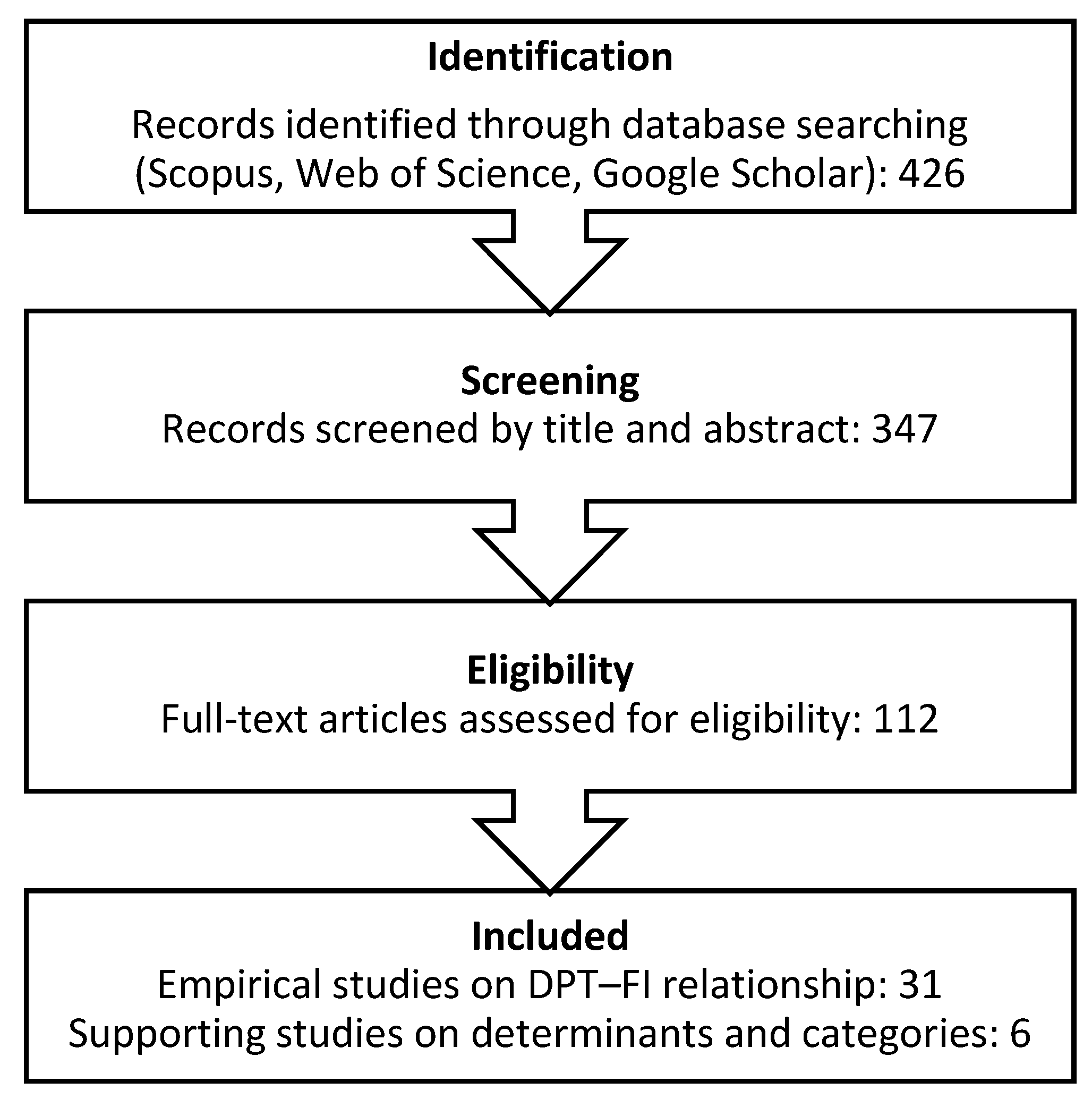 Figure 2 summarizes the systematic screening and selection process. It shows that 426 records were initially identified, 347 remained after duplicates were removed, 112 full-text papers were assessed for eligibility, and finally, 37 empirical studies were included in the review—31 focusing on the DPT–FI relationship and 6 on determinants and categories of DPTs.