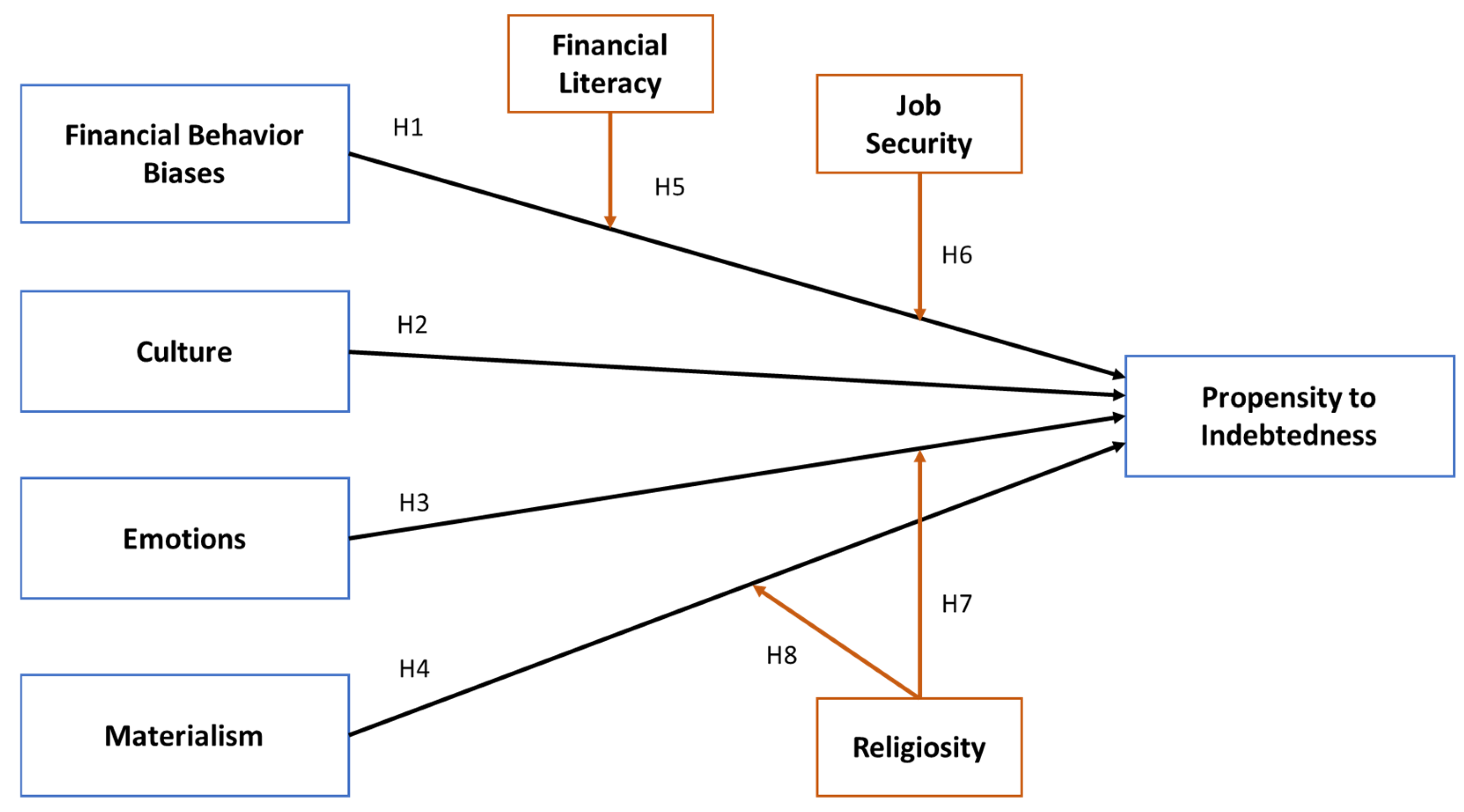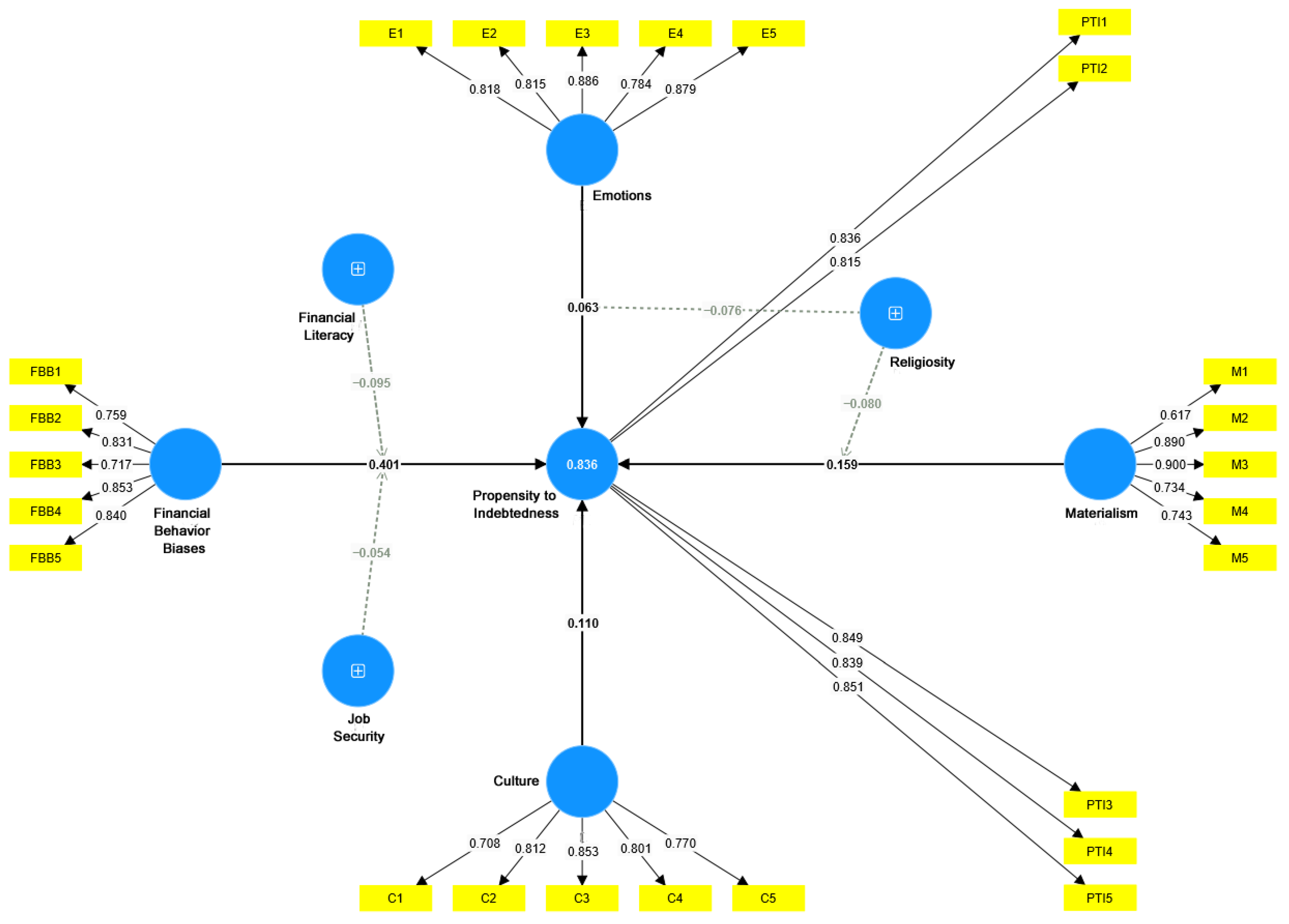 | H6 | Financial behavior biases × job security → Propensity to indebtedness | 0.054 | 2.075 | 0.019 | Supported |