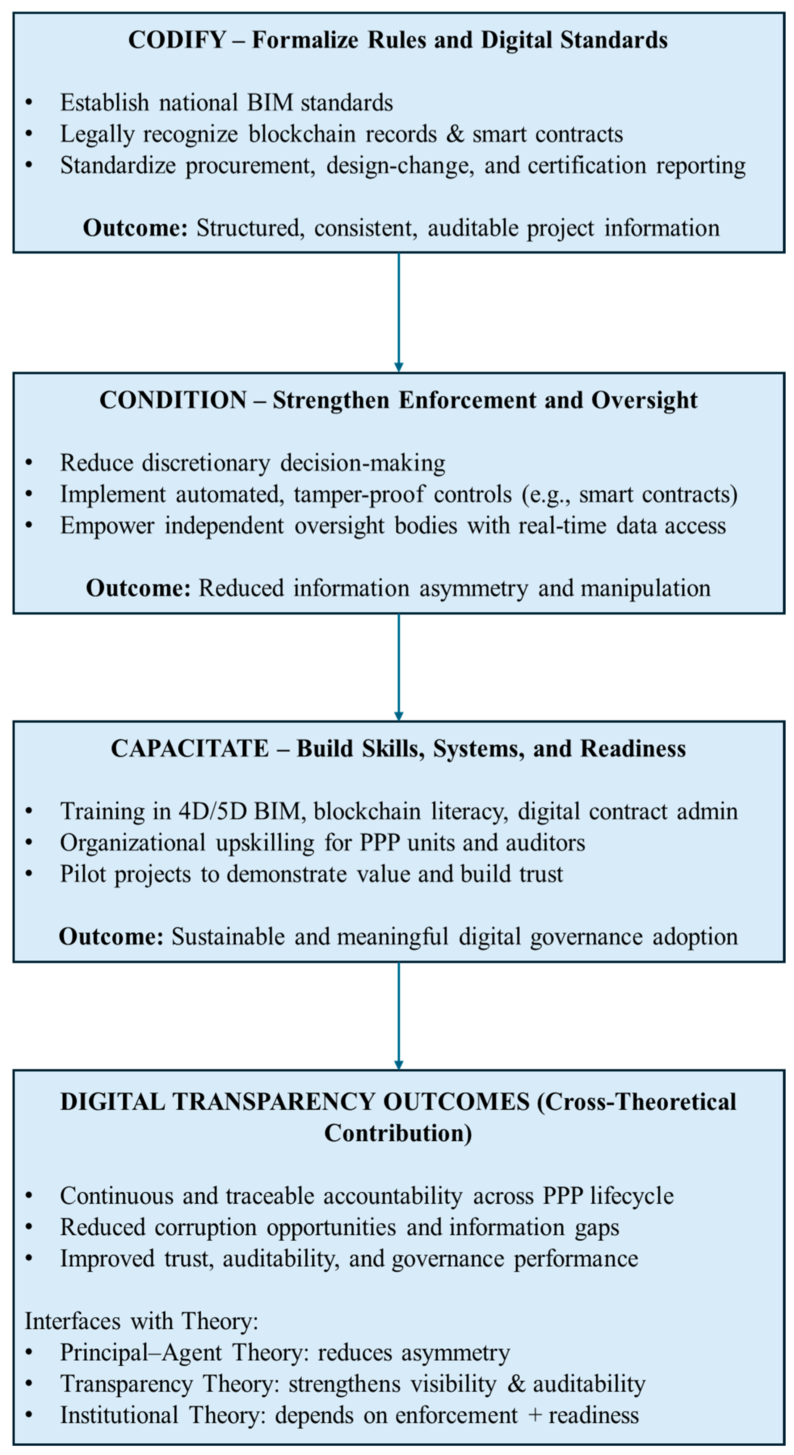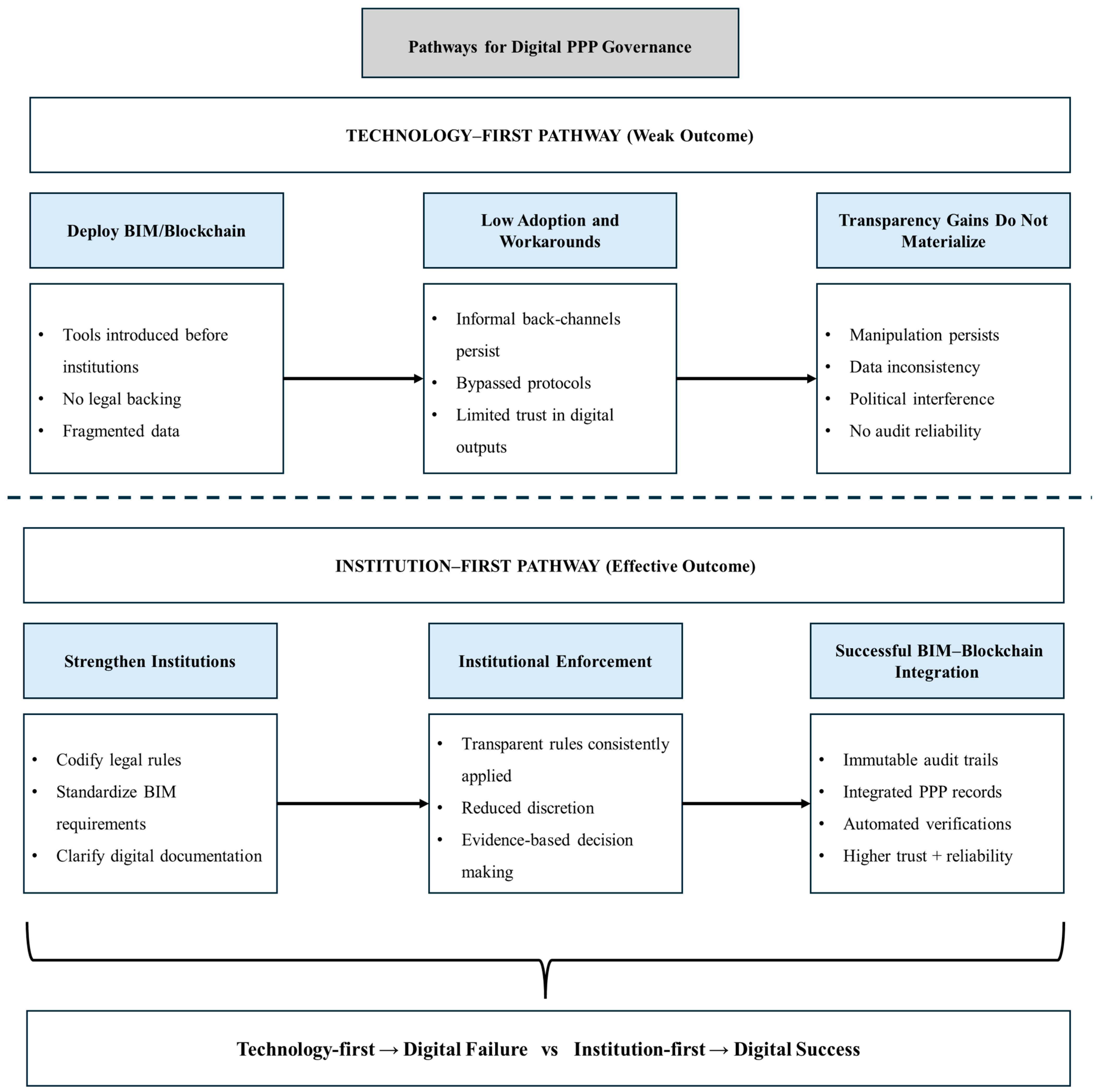 | BIM–Blockchain Pilot Projects | None in construction or PPPs | Integrated BIM–blockchain payment validation in public works | Pilots in procurement tracking and design audit trails | Pilots in asset management and logistics transparency |