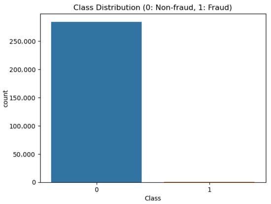 Class distribution showing legitimate (0) vs. fraudulent (1) transactions.