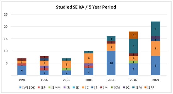 Figure 2 presents the historical breakdown of the number of studied papers through the KAs of SE. Overall, the figure displays a growth trend in the number of studied papers on software productivity. In the last five years, the number of analyzed papers is three times greater than in the initial period. Some diversification in addressed KAs is noticeable, with general studies (recorded under the tag SWEBOK in this study when many phases were addressed in a single paper) being substituted by specific ones, mainly SE management practices (cf. SEM: [5,6,10,35,36,37,38,39,40,41,42,43,44,45,46,47]). In the past, papers addressed more traditional phases of development processes, from design to maintenance (cf. SD, SC, ST, SQ, SCM and SM). Despite the general growth, only a few articles address social aspects (cf. SEPP) and early stages of software development processes (cf. SR).