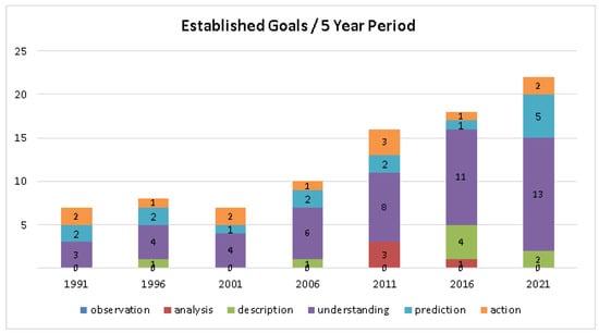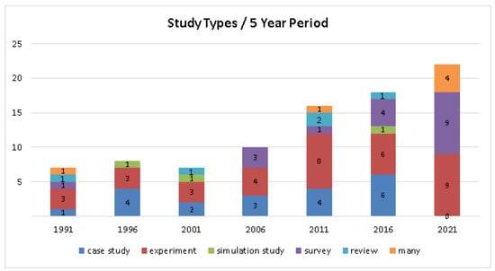 Some bar charts are also presented here to show evidence at a high level of granularity and facilitate the development of temporal trend and gap analyses of included studies. However, these charts are not comparable to those shown in the previous study [13] since a period of 35 years is analyzed here, equally divided into five-year periods from 1987 to 2021.